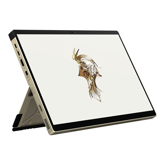 Начнём сразу с самого интересного, на чём сделан акцент в пресс-релизе. Ноутбук ROG Flow Z13-KJP представляет из себя 13.4-дюймовое устройство с IPS-матрицей с разрешением 2560 x 1600 точек, частотой обновления 180 Hz, временем отклика 3 мс GtG и 100% охватом цветового пространства DCI-P3. Сзади присутствует выдвижная подставка, а спереди можно подключить клавиатуру. Новинка выполнена в золотистом дизайне с вставкой из углеродного волокна, а также украшена узорами, причём не только в виде принта на алюминиевом корпусе, но и в виде обработки металла на станке с ЧПУ.