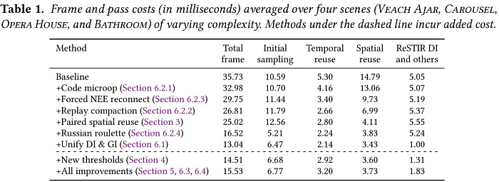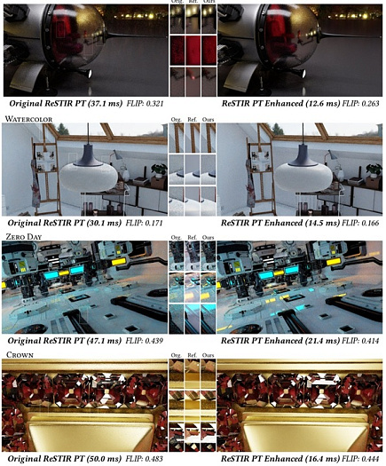 Предоставленные сравнения демонстрируют приличную разницу в производительности: если оригинальная версия ReSTIR PR требует 37.1 / 30.1 / 47.1 / 50.0 мс для отрисовки сцены, то ReSTIR PR Enhanced снижает временные затраты до 12.6 / 14.5 / 21.4 / 16.4 мс, а заодно повышает общее качество, не так сильно страдая от алгоритмов шумоподавления.