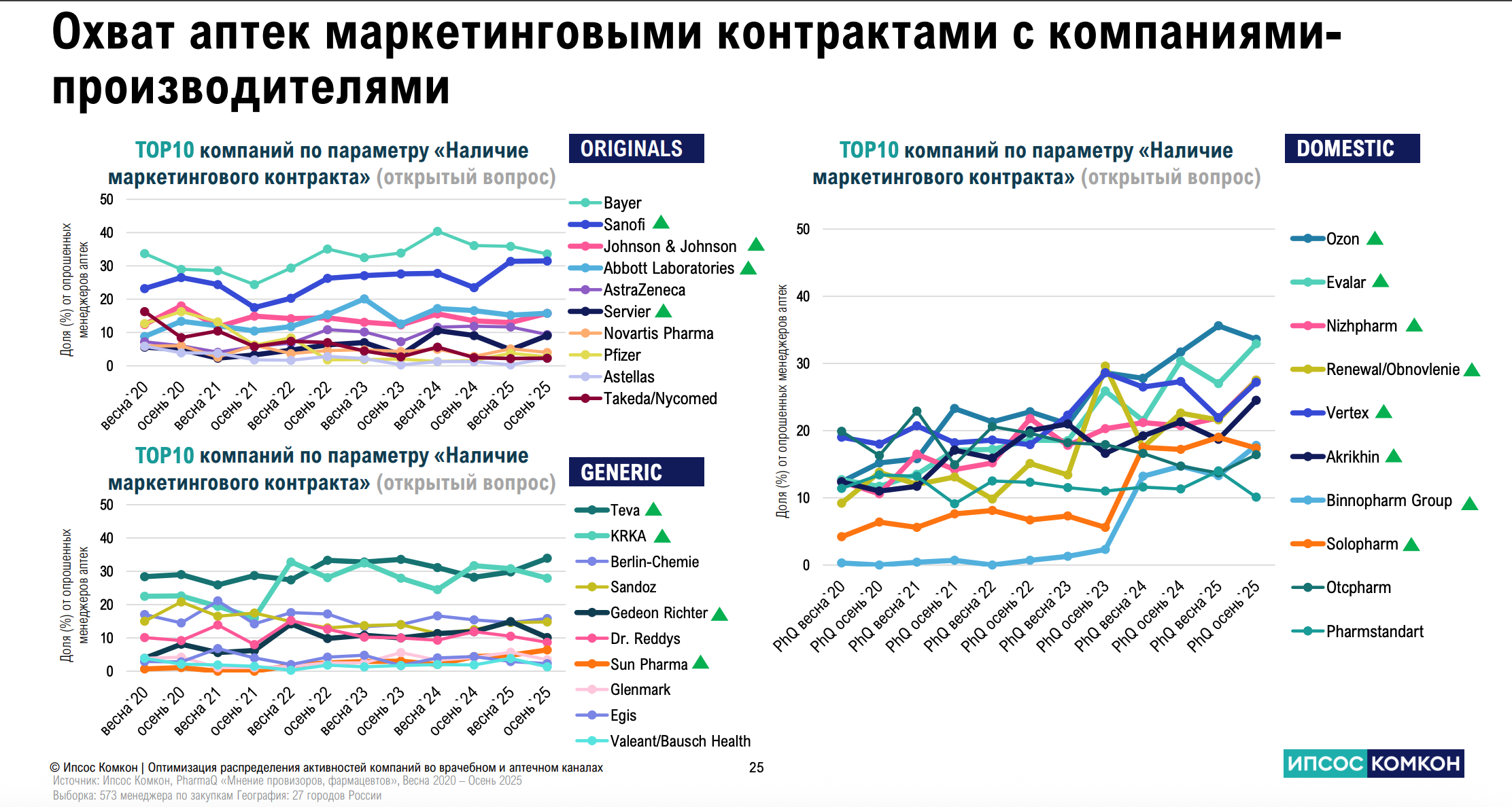 Аналитики компании «Ипсос Комкон» представили результаты пятилетнего исследования, охватывающего период с весны 2021 года до осени 2025-го, на вебинаре «Аптечный сегмент: лучшие практики и подходы в продвижении». Был проведен опрос среди 573 менеджеров по закупкам из 27 городов России. Доля отметивших наличие маркетинговых контрактов с компаниями-производителями составила 52%. Этот показатель вырос на 6% за пять лет. В первую очередь рост суммарного охвата маркетинговыми контрактами обусловлен сетевыми аптеками. По несетевым аптекам уровень охвата существенно ниже.