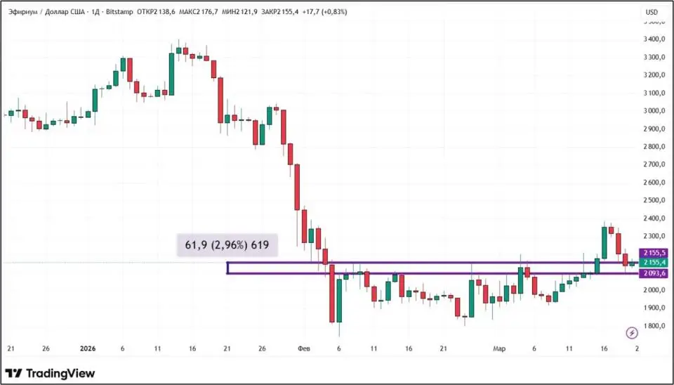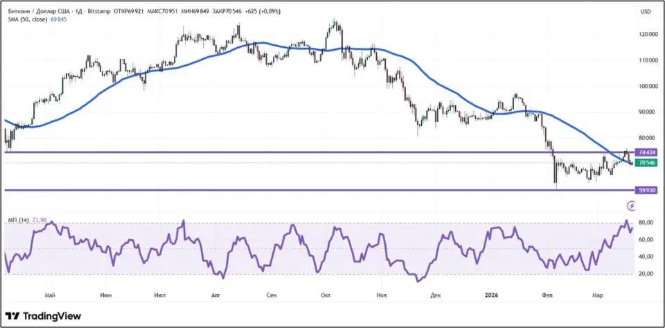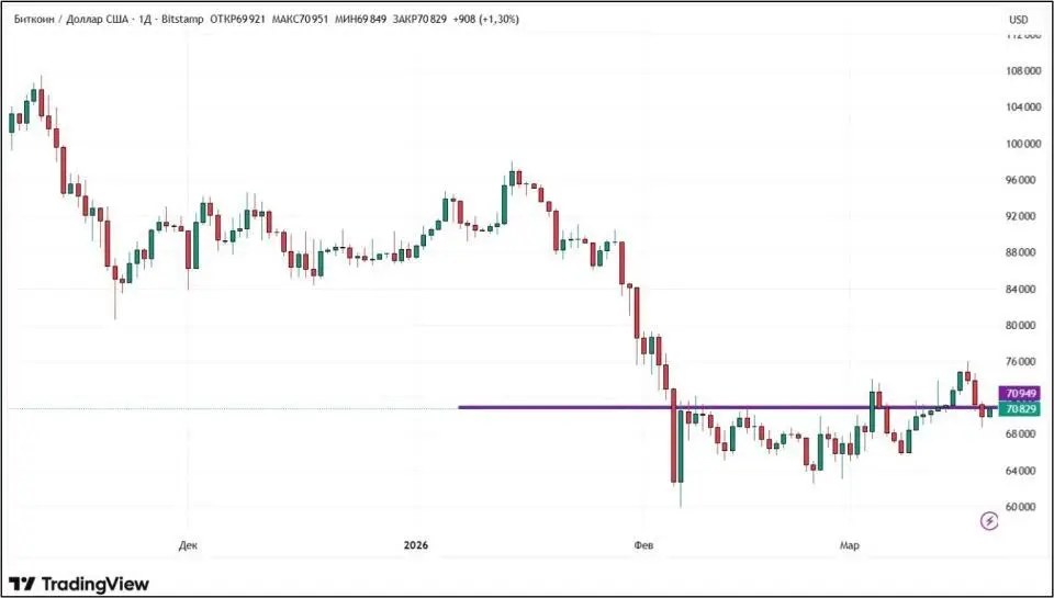 Стоимость биткоина с 13 по 20 марта 2026 года практически не изменилась. Однако сказать, что первая криптовалюта находился в стазисе — нельзя. На торгах во вторник, 17 марта, биткоин стоил дороже $76 000 — подобного с ним не случалось последние полтора месяца. Далее последовало закономерное снижение.