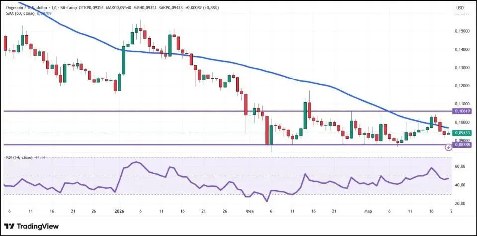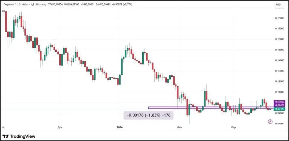 Dogecoin с 13 по 20 марта снизился в цене на 1,83%. Главный мемкоин безуспешно пытается закрепиться выше важной психологической отметки $0,1. Очередная попытка покупателей сделать рывок оказалась неудачной.