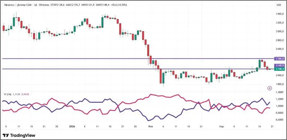 С точки зрения технического анализа, тренд эфира — восходящий. Об этом свидетельствует превышение ценой 50-дневной скользящей средней (отмечена синим цветом). Кроме того, в пользу быков говорит линия VI+ (фиолетовая) индикатора Vortex, которая превышает VI- (розовую). Уровни поддержки и сопротивления на дневном графике: $2150 и $2386 соответственно.