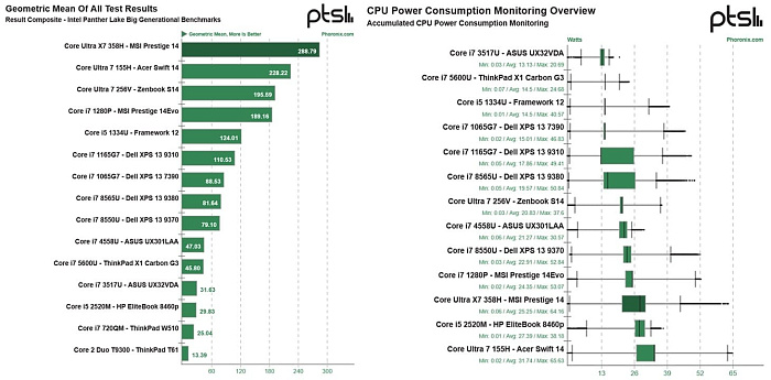 Для своего тестирования он обзавёлся 15 ноутбуками с мобильными процессорами Core Ultra X7 358H (Panther Lake), Core Ultra 7 256V (Lunar Lake), Core Ultra 7 155H (Meteor Lake), Core i5-1334U (Raptor Lake), Core i7-1280P (Alder Lake), Core i7-1165G7 (Tiger Lake), Core i7-1065G7 (Ice Lake), Core i7-8565U (Whiskey Lake), Core i7-8550U (Kaby Lake), Core i7-5600U (Broadwell), Core i7-4558U (Haswell), Core i7-3517U (Ivy Bridge), Core i5-2520M (Sandy Bridge), Core i7-720QM (Clarksfield) и Core 2 Duo T9300 (Penryn). Замер возможностей проводился в 150 приложениях и в среде операционной системы Ubuntu 26.04.